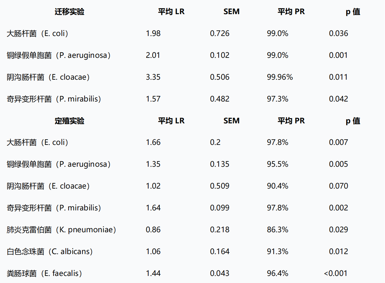 与普通医用材料相比,带有鲨纹微结构的医用材料,对包括大肠杆菌、肺炎克雷伯菌在内的多种细菌迁移和定殖,可减少 86% 至 99.96%(见下表)。