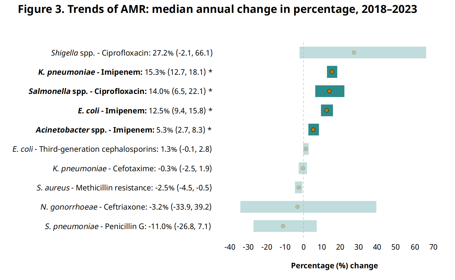 这份最新报告,首次公布了用于治疗泌尿道和胃肠道感染、血液感染以及淋病的22种抗生素的耐药率估计值。报告涵盖了8种常见细菌病原体,其中特别指出大肠杆菌和肺炎克雷伯菌是感染中发现的主要耐药革兰氏阴性菌。